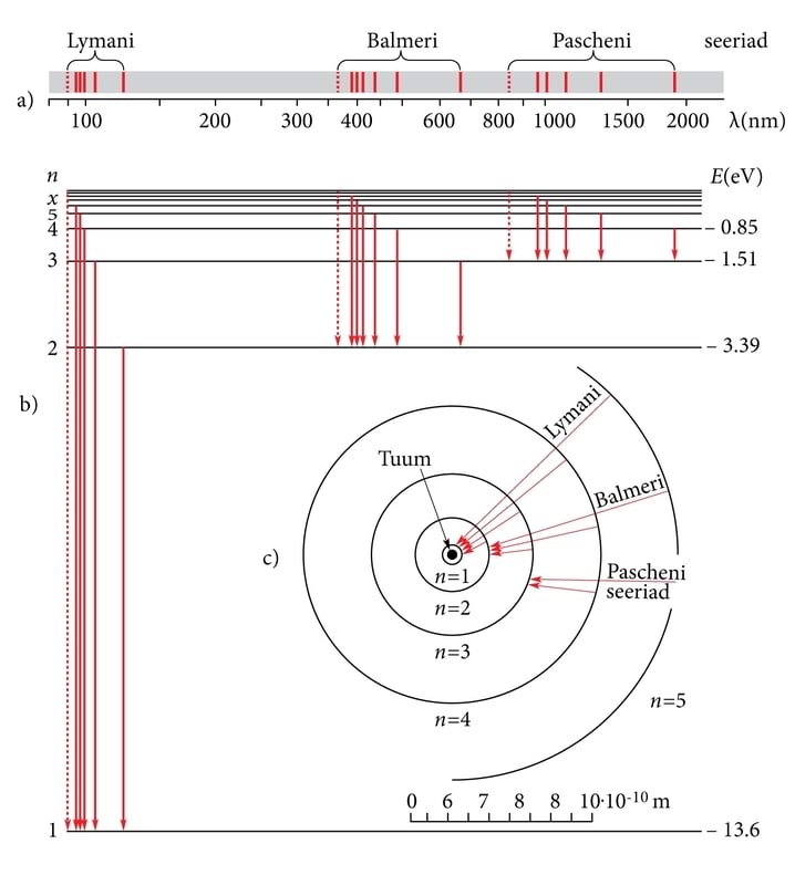 Miinusmärk johtub sellest, et nullnivooks loetakse elektroni potentsiaalne energia, kui ta on tuumast eemaldatud lõpmata kaugele. Joonisel 7.7 on valemi (7.9 ) järgi arvutatud energiatasemete skeem.