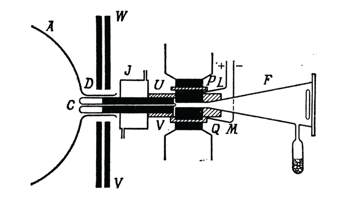Tema tulemused on esitatud joonisel 47 oleval skeemil, mis on füüsikas üks tuntumaid, aga ka üks eksitavamaid. Esmakordselt avaldati see Marie Curie dissertatsioonis (1903. a.) ja sestpeale on see peaaegu kõigis füüsikaõpikuis. Skeemil on näidatud -, - ja -kiirte trajektoorid magnetväljas, mis on risti joonise tasandiga ja suunatud lugeja poole. Ent skeem on vaid lihtne illustratsioon: -kiired hälbivad tõesti kergesti, kuna -kiirte hälvet on väga raske kindlaks teha. Nagu edaspidi näeme, oli ainuüksi selle avastamine väga peen töö. Joonisel 47 toodud skeemile tuleb alati lisada, nagu tegi seda Rutherford oma raamatus „Radioaktiivsus", et -osakeste hälve on sellel tublisti liialdatud. Et -kiiri oli kerge magnetväljaga hälvitada, siis uuriti neid ka esimesena. Rutherford jõudis järeldusele, et -kiired käituvad täpselt nii nagu katoodkiired ja on tõenäoliselt elektronide voog. 1900. a. tegi Becquerel fotograafilisel meetodil kindlaks, et laengu ja massi suhe on -kiirtel ligikaudu sama mis elektronidel, aga kiirus umbes pool valguse kiirusest. Rutherford ei uskunud, et elektronid saavad selle kiiruse alles hetkel, mil nad aatomist välja paiskuvad. Usutavam näis, et nad liiguvad nii kiiresti juba aatomis.