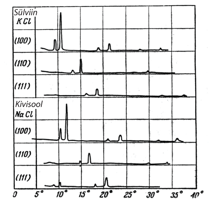 Ent miks puudus esimest järku peegeldus KCl kristalli tasandeiit ()? Põhjus osutus lihtsaks: kaaliumil ja klooril on ligikaudu ühepalju elektrone. Saadud tulemused vastasid aatomite paigutusele, mis on näidatud joonisel 45. See oli esimene dešifreeritud kristallistruktuur ja dešifreerijaks oli W. L. Bragg 1913. a.