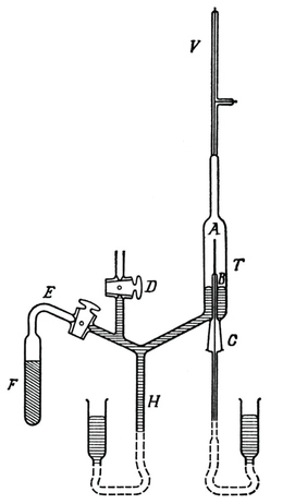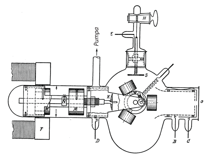 Rutherfordi mõte oli koguda piisavalt a-osakesi, tekitada neis elektrilahendus ja uurida siis tekkinud helendust spektromeetriga. Tõsi küll, selleks pidi ta olema kindel, et seadmesse ei .satu võõraid aatomeid. Rutherford ja tema kaastöötaja Royds valmistasid joonisel 49 näidatud seadme. Selle tähtsaim osa oli vilunud klaasipuhuja poolt meisterlikult valmistatud peenike klaastoru , milles oli puhastatud radoon, mis, nagu oli juba teada, kiirgab üksnes -osakesi. Mõne aja möödudes võib torus oleva gaasi pumbata lahendustorru ja seda seal uurida. Kui midagi ei avastata, võib suruda gaasi uuesti torru ja jätta ta sinna pikaks ajaks.