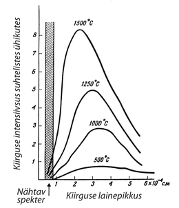 ja jõuab temperatuuri tõustes spektri ultraviolettosani. Kiirguse intensiivsuse tõus lainepikkuse lühenedes - graafikul joonte parempoolsed harud - oli heas kooskõlas Rayleigh’ ja Jeansi (1877-1946) teooriaga, kuna intensiivuse vähenemine lühematel lainepikkustel erines sellest märgatavalt.