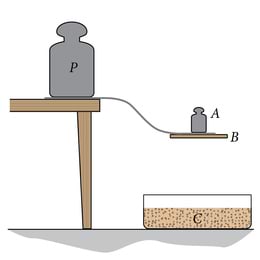 Paberlindi üks ots surutakse raske koormuse P abil laua ääre peale (vt joonis). Teine ots surutakse vihi A abil vastu tahvlikest B, mida hoitakse käes. Kui tahvlikest aeglaselt allapoole lasta, siis lint katkeb. Kui aga tahvlike lahti lasta (kukub koos vihiga liivakasti C), siis lint ei katke. Seletage nähtust.