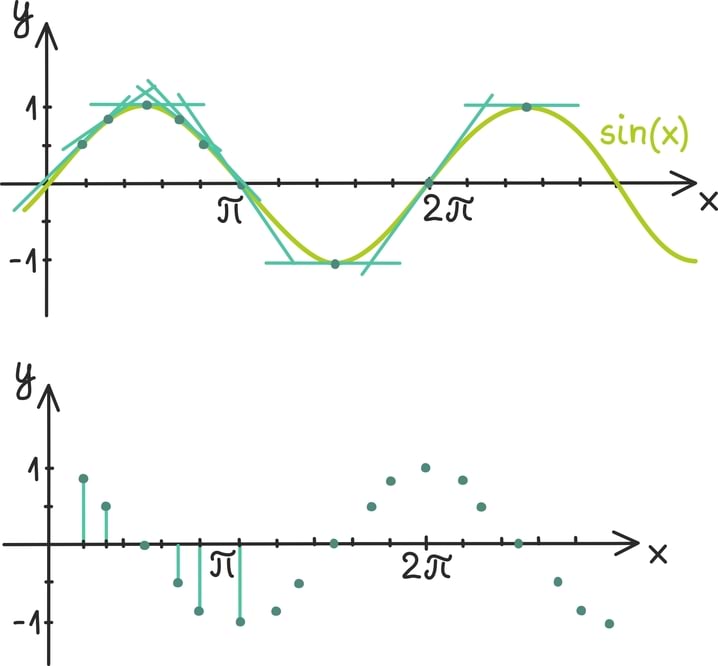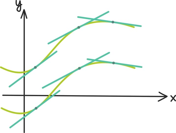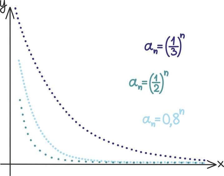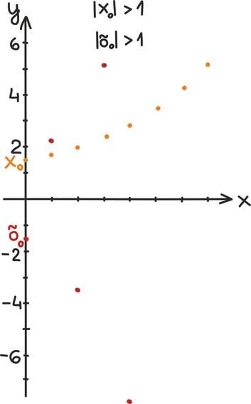 Oletame näiteks, et hakkame ühte arvu iseendaga korrutama. Kui selle arvu absoluutväärtus on suurem kui 1, satume nullist järjest kaugemale, kui aga arvu absoluutväärtus on 1-st väiksem, läheneme järjest nullile. Järgnevatel graafikutel oleme võtnud neli arvu x0, õ0,y0 ja z0 ja hakanud neid iseendaga korrutama. Kahe esimese absoluutväärtus on ühest suurem ning nii suunduvad iseendaga korrutamisel saadud arvud nullist järjest kaugemale. Kahe viimase absoluutväärtus on ühest väiksem ning nende korrutised koonduvad nulli suunas.