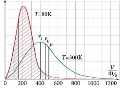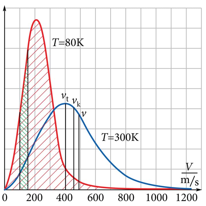 Gaasi molekulid liiguvad kaootiliselt erineva kiirusega. Järgnevalt on graafiliselt kujutatud sama gaasi molekulide kiiruste jaotust kahel erineval temperatuuril. Kiiruste jaotust madalal temperatuuril näitab punane joon ja punasega viirutatud osa pindala mõõdab molekulide koguarvu. Rohelisega viirutatud pindala mõõdab kiiruste vahemikus liikuvate molekulide arvu. Pindalade suhe näitab, mitmendik osa molekulidest liigub kiirusega .
