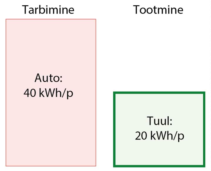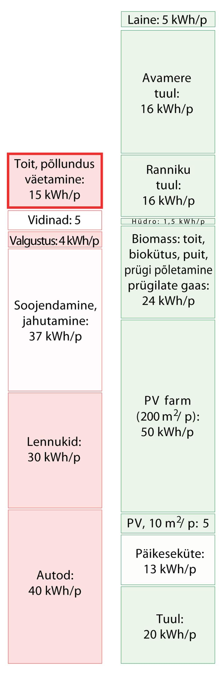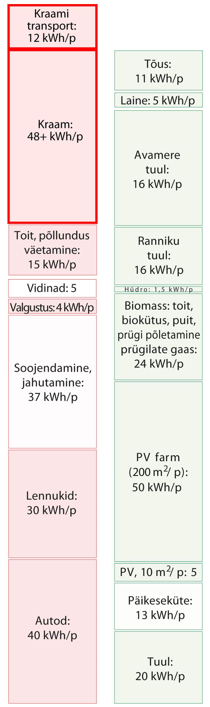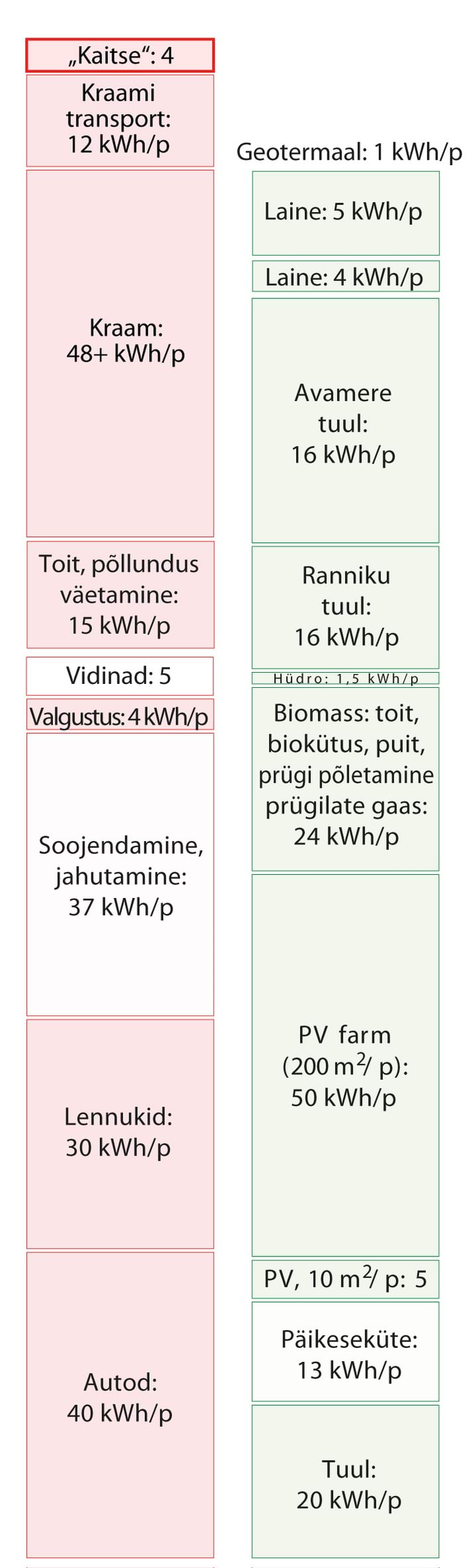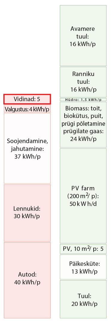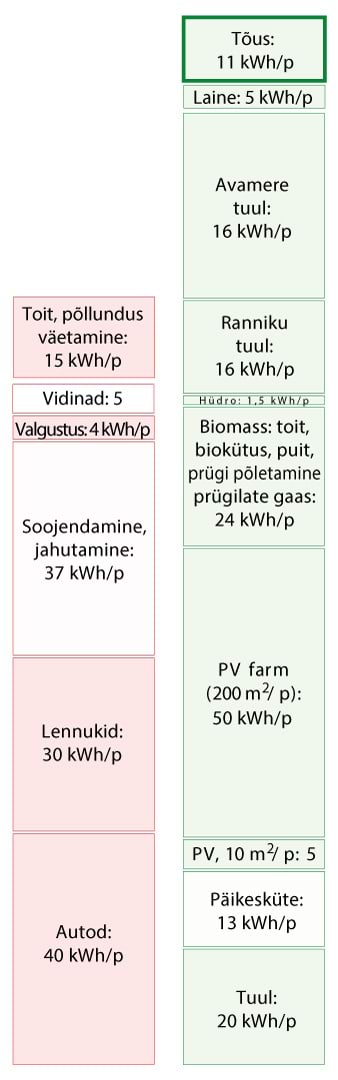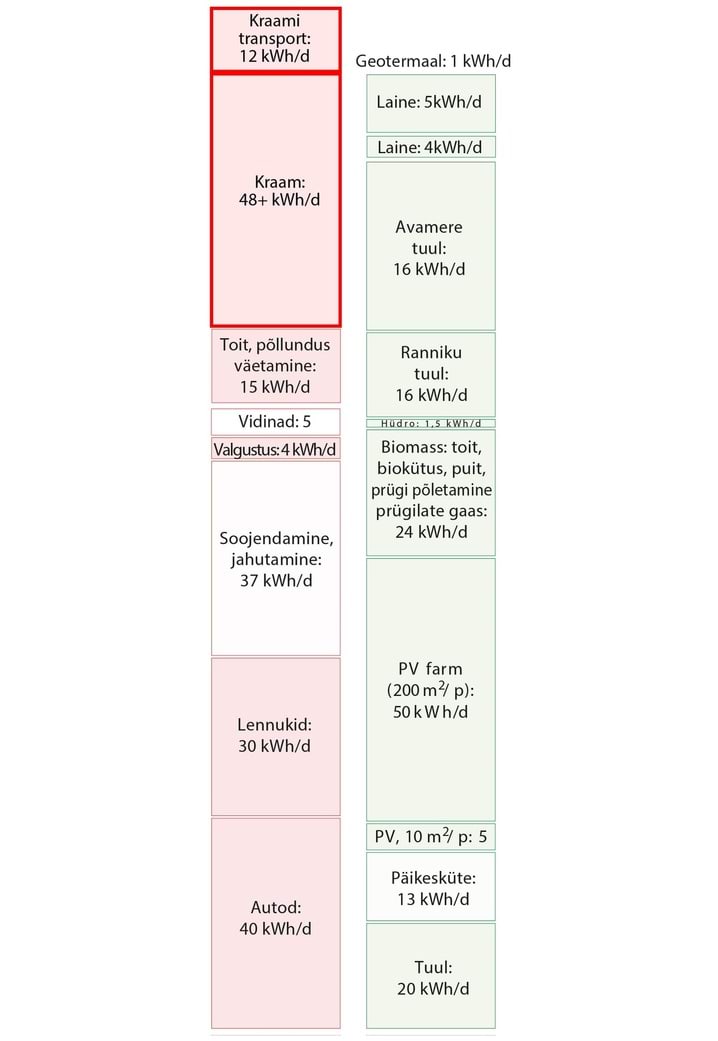 Kui kasutatakse numbreid, muudab nende suurus need tihtipeale hägusaks. Numbreid kasutatakse mulje avaldamiseks, sõnasõjas punktide võitmiseks, teavitamata jätmiseks. Minu eesmärk on seevastu tuua välja ausad faktidel põhinevad numbrid nii, et need oleks arusaadavad, võrreldavad ja meeldejäävad. Need numbrid on muudetud arusaadavaks sellega, et on väljendatud igapäevastes personaalsetes ühikutes. Energiat väljendatakse kilovatt-tundides () elaniku kohta, samades ühikutes, mida võib näha tavalisel elektriarvel; ja võimsust kilovatt-tundides päeva kohta (kWh/p), samuti ühe elaniku kohta. Joonisel 2 on näitena võrreldud mõningaid suurusi neis ühikutes. Punases tulbas (tarbimine) on näidatud, et kui sõita tavalise autoga päevas , kulutab see päevaga energiat. Paremal pool, rohelises tulbas (tootmine), on välja toodud mõned taastuvad energiaallikad: kui katta riigi territooriumist tuuleparkidega, toodaks see päevas elaniku kohta elektrienergiat.