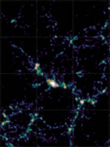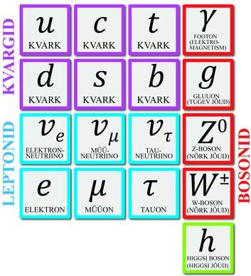 | Higgsi bosoni tekkimine ja lagunemine Euroopa tuumauuringute keskuse kiirendi detektoris. Higgsi boson on elementaarosake, mis annab kõikidele teistele osakestele massi. Kollased punktiirjooned kujutavad bosoni lagunemisel tekkinud ülisuure energiaga elektrone. | Universumi kärgstruktuur. Heledamad alad tähistavad galaktikaparvi. Parved on omavahel ühendatud galaktikaahelatega. Ühe kärjesilma läbimõõt on miljardeid valgusaastaid. |