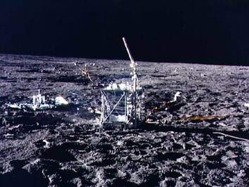 | Umbes 30 m läbimõõduga kraater, mis tekkis 14. aprillil 1970. a kokkupõrkel Kuuga. See asub Mare Cognitumist põhjas –2,55° laiuskraadil ja –27,88° pikkuskraadil. | Seismojaam Apollo 12 maandumiskohas Kuul. Seismograaf jälgib pinna liikumisi, registreerides seismilisi laineid. Vasakul paiknev mõõteseade on muutuva temperatuuri ja sellega kaasnevate soojuspingete eest kaitstud metallfooliumiga. |