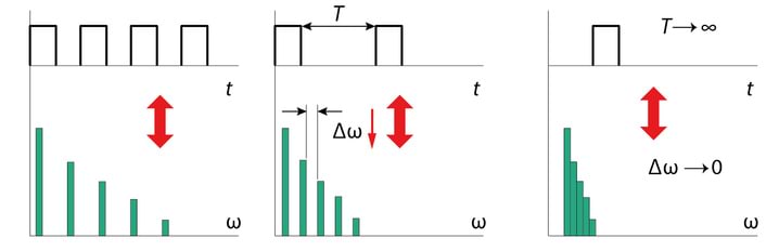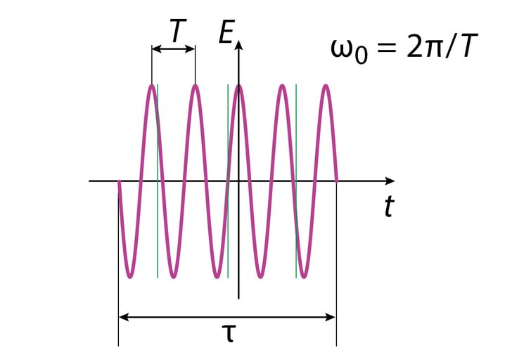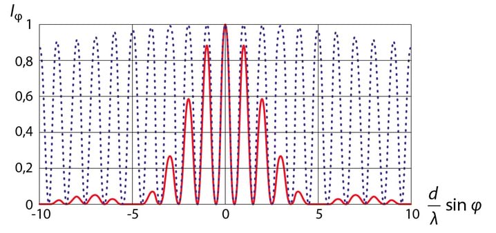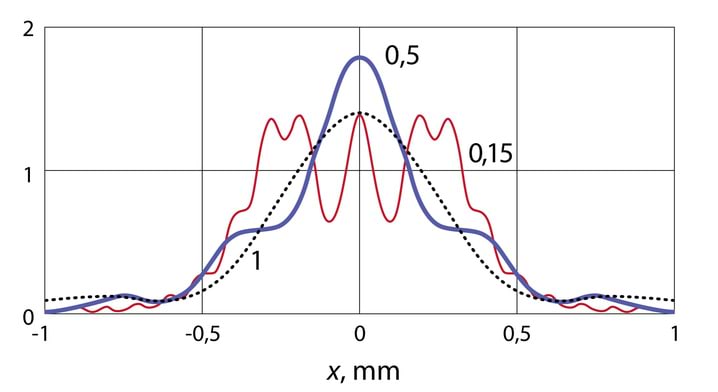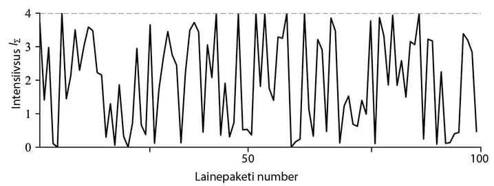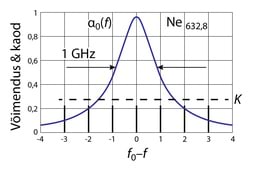 Näeme, et peeglitevahelises ruumis võimalike moodide arv on väga suur, kuid antud tingimustel mahub laiuse spektrijoone piiridesse vaid üks mood, teised moodid on tühjad.