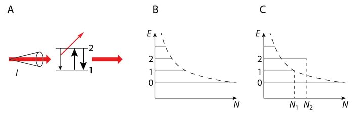 Kui on täidetud tingimus , siis tõenäosusega footon neeldub, st aatom siirdub seisundisse . Aatomi eluiga selles seisundis, tema siirdumine seisundisse võib toimuda nii kiirguslike kui ka mittekiirguslike protsesside tulemusena. Kiirguslikul üleminekul kiirgab aatom aja möödudes juhuslikus suunas sama sagedusega footoni. Sellist kiirgusmehhanismi nimetatakse resonantskiirguseks. Kiiratud footon neelatakse naaberaatomi poolt, mis omakorda kiirgab sama sagedusega ning juhuslikus suunas leviva footoni jne. Mittekiirgusliku ülemineku näiteks on mitteelastne põrge naaberaatomiga, mille tulemusena seisundisse salvestatud energia transformeeritakse kulgeva liikumise energiaks ja esialgses suunas leviva valguse kiiritustihedus väheneb.