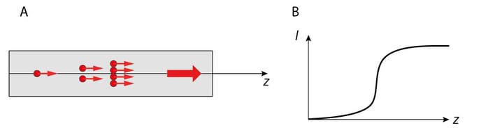Sellises aktiivkeskkonnas juhuslikult z-telje suunas leviv footon põhjustab sundkiirguse tõttu uue ning samas suunas leviva footoni tekke ja algab footonite laviinikujuline kasv, valguse intensiivsus kasvab nagu